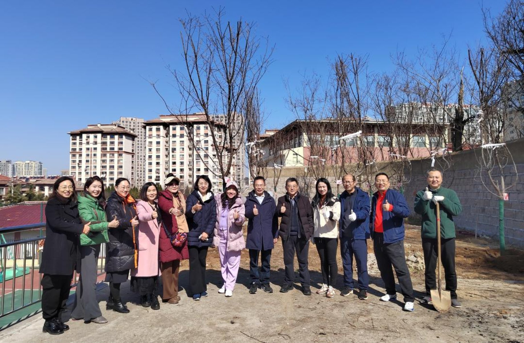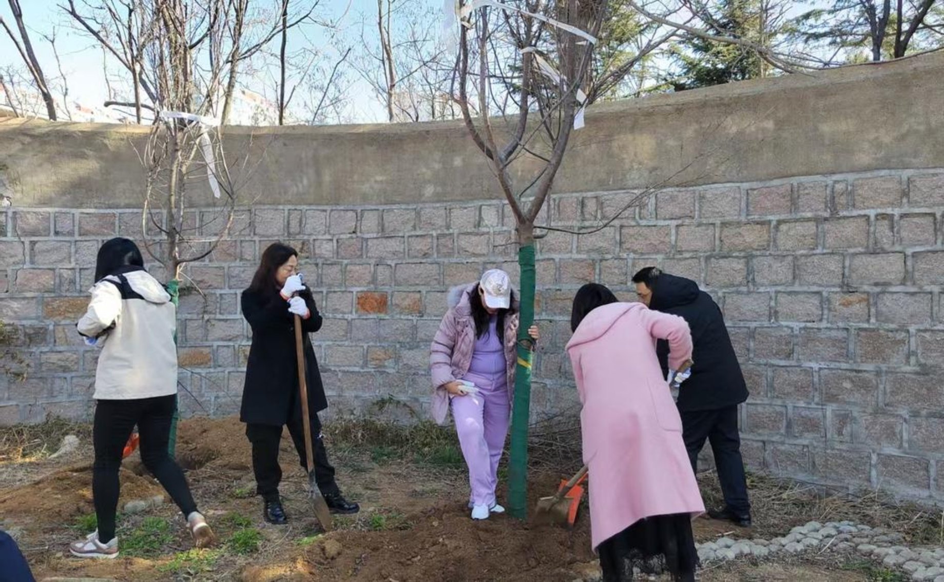 活动现场,春风拂面,暖意融融。本次活动采用“一对一”协作模式,一位校友搭档一位教职工,共植一棵“友谊之树”。扶苗正干、挥锹培土、踏实根部、提桶浇水,每一个步骤都饱着对情谊的珍视。平日里在商海职场运筹帷幄、在会议室中思辨研讨的校友们,此刻俯身大地,动作娴熟而专注;研究院的教职工们也卸下了工作中的严谨,与老友新朋谈笑风生,现场洋溢着温馨融洽的氛围。一位校友轻拍刚栽好的树干,望着挂在枝头的认捐铭牌笑言:这棵树就是我的“化身”,以后年年都要来看看它,也看看研究院的新变化。此次植树活动受青岛校友会李明会长委托,在臧建庆秘书长组织下,校友们向best365英国在线体育捐赠30株樱花树,此外,best365英国在线体育副院长刘锋还特意捐赠6棵樱花蜜桃树苗,期待来年,校友和教职工们既能共赏樱花如云,也能同品蜜桃清甜,共享事业与生活的双重美好。